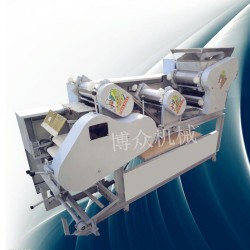 高速靜音餛飩皮機 全自動餛飩皮機 圖片展示 操作指南本機器適合批發零售餃子皮機,混沌皮機,清湯皮機,面條掛面的廠家。具有操作簡單方便,可以節約大量的人力資源,不會產生邊角料,也不需要其他的額外補助設備,方便您的生產。 性能及優點: 1、采用多輥型一次性成型原理,皮子大小、薄厚均勻一致. 2、機器操作方便,皮子薄厚可調,大小可按模具定制,適用于多種規格餛飩皮,餃子皮,清湯皮,抄手皮 面條掛面生產。 3、本機全部采用不銹鋼材料,結構合理,維修、拆裝、清洗簡單方便。 4、本機除可一次成型外,還可自動折疊面皮,手工切片。根據您的需要可調形狀尺寸。餃子皮機具有高效節能、安全衛生、無邊角廢料、大小厚薄可變等優點,使所生產餃子皮在外觀、口感、重量達到空間統一,從而徹底改變了目前生產效率低、員工浪 費、二次污染、中部裂口等現狀,該仿手工餃子皮機除具有以上優點外,還可根據生產需要改變出皮速度等優點。(1)采用高強度軋輥(加厚),經過多次壓延,面皮密實光滑,厚薄均勻的優點!(2)具有先進的雙面撒粉機構,節約干粉(撒粉的大小量可調,粉箱帶有離合器)!(3)自動折疊功能,疊皮均勻整齊。餃子皮具有大小厚薄可調等優點!(4)可做餃子皮、餛飩皮、云吞皮、清湯皮、包子皮、大餅、燒餅、面條、鮮面條等面食。(面皮的薄度在0.2mm以上都可以做)!(5)結構合理 美觀大方 效率高 操作方便 省工省力 無噪音!本公司供應多功能商用餃子皮制作機 餛飩皮機,品牌博眾。質量*保*,歡迎咨詢 餃子皮機、餛飩皮機是幾組對輥連續輥壓,一次成型原理設計制造的,它有電機,減速機裝置,傳動裝置,兩組供料粗壓輥,一組合片軋實軋輥,一組軋實輥,一組軋光輥組成。該機組的配套設備是:拌面機與和面機。將和好的面坯倒在主機上面的料斗內,自動喂給粗軋輥,壓出兩塊面板,然后合并進入合片軋實輥,在通過面槽引入第三道軋輥,壓實壓薄,進入壓光輥內,精壓軋光,面片通過模具一次成型。面片的厚薄是靠手輪調整器來調整,面片跑偏說明兩輥間隙不一致,應調整兩端手輪,使其均勻即可。精壓輥光輥的間隙大與小和面片的厚薄相關,可根據當地需要進行調整。本機采用鏈條、鏈輪傳動,傳動部分為變速箱結構,持久耐用,并附加全自動回皮裝置,減少了操作者的勞動強度,增加了功效。邢臺博眾餃子皮機生產廠家 制造與銷售。是一家實力雄厚的實體企業。 多年來以優質的餃子皮機產品、合理的餃子皮機價格、創新的經營方式以及完善的售后服務,贏得了全國二十幾個省、市、地區廣大用戶的好評。我廠秉承“顧客至上,銳意進取”的經營理念,堅持“客戶第*”的原則為廣大客戶提供優質的服務。