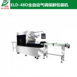 依利達ELIDA牌ELD-48D 全自動氣調保鮮包裝機主要由機架、送膜機構,送盒機構、進料輸送帶,出料輸送帶,定位輸送帶,真空箱體,上下模具、保鮮氣體充配氣系統、氣動執行系統、加熱模溫控系統、電氣自動控制系統組成。