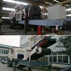 2、山東濟南日處理6000噸的石灰石碎石制砂生產線,使用有鋼機械的移動破碎站