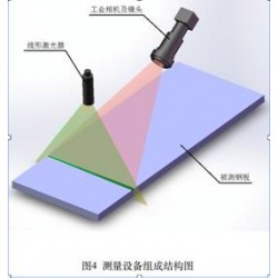 對于冷軋鋼板或冷卻后的熱軋鋼板的寬度測量,為了拍攝出清晰的測量基準線,在鋼板上方設置一個線形激光器,激光器發出的激光與鋼板寬度方向平行。如圖4所示。這樣,工業相機拍攝到的鋼板圖像上激光束照射的部位將會有一條清晰的亮線,根據這條亮線所占用的像素數即可得到鋼板的寬度尺寸。