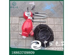 1.滾筒倉中的軟軸為手動。不能使用自動裝置。使用時先將滾筒中的細軟軸拉出長于疏通機身,然后將滾筒中的細軟軸穿過疏通機(從不帶自動頭的一方穿過)并將滾筒的銷子提起卡在疏通機機頭的圓孔中,疏通時先用手將滾筒中的細軟軸拉出,放入被堵的管道,一直到觸到堵塞物為止,然后打開開關,一手握住軟軸施以動擊力,另一手操作離合手柄,使軟軸旋轉并通過改變開關所在正反轉的位置,交替反復操作。是軟軸正傳反轉進行疏通。當需要從滾筒中再抽出些細軟軸時,一定要松開離合手柄,再往出抽,否則離合手柄將細軟軸緊緊鎖住,將無法抽出細軸。