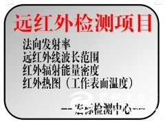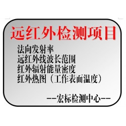 -------外觀、尺寸偏差、功率偏差、工作溫度、溫度不均勻度、升溫時間、異常溫度、工作溫度下的泄露電流、工作溫度下的電氣強度、防水等級實驗、潮濕狀態下的泄露電流、潮濕狀態下的電氣強度、冷態絕緣電阻、熱態絕緣電阻、導線的標稱橫截面積、抗拉伸性能、刮劃、剝離強度、冷彎曲性能、冷折性能、耐低溫性能、耐熱,耐燃、抗沖擊性能、墜落、電-熱輻射轉換效率、快速老化試驗、法向全發射率、紅外輻射波長范圍(輻射能譜)、表面溫度分布(紅外熱圖)、耐冷熱交換性
