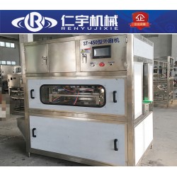 RY型自動外刷桶機是桶在輸送帶的輸送力作用下,進入刷桶清洗機內,經檢測準確計數后定位裝置將空桶推送至主旋轉毛刷夾角并將桶定位夾緊;內刷在電動裝置和汽缸的帶動下進入大桶內一切就緒后信號輸出指令內刷外刷同時啟動,主旋轉毛刷運轉方向和內刷的的運行方向相反,桶在毛刷的作用下自動完成桶身、內外壁、桶頸、桶底的徹底清洗工作;沖洗水泵不斷地向各毛刷噴水或清洗劑,并由下部的接水盤收集后進入清洗劑水箱