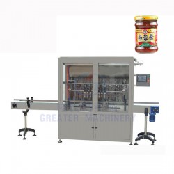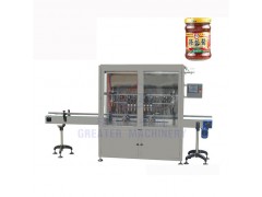 4、全自動直線式醬料灌裝機_蒜蓉醬灌裝機采用防滴漏與拉絲的灌裝悶頭,確保瓶口定位和無污染。