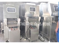 鹽水注射機有氣動、機械、變頻等幾種。鹽水注射機是將鹽水及輔料通過鹽水注射、真空滾揉,注入肉中的料液充分腌漬,滲透,疏松肌肉組織結構,有利于肌球蛋白溶出,并且由于添加劑對原料肉離子強度的增強作用和蛋白等特點的調整作用,注入配制的水溶液能使肉質嫩化、松軟,從而提高了肉制品的出品率和改善肉制品的嫩度和口感。 可根據不同工藝要求,調整步進速度,步進距離,壓肉板間隙及注射壓力,將腌漬液均勻連續地注入肉中,達到理想的注射效果。