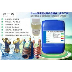 佳一美研發團隊已經研發出了環保的,通用于所有銅,銅合金的表面防銹抗氧化的銅材鈍化液,取代傳統鉻酸工藝,單一藥劑。產品編號:JYM-106。佳一美銅材鈍化液系無色透明水性液體,不蒸發不揮發,無任何氣味,只需常溫浸泡10分鐘即可,可反復循環使用。經其鈍化處理后的銅件,可保持在自然狀態下,一至兩年不氧化不變色。可過中性鹽霧測試96小時以上。銅材鈍化液JYM-106是環保型銅材無鉻鈍化劑,本品呈弱堿性產品,且不含鉻等有毒害物質。本品是針對提高各類銅材產品銅制品的抗腐蝕能力而開發。它采用環保、有機雜環化合物并添加多種復合添加劑從而達到一個穩定**的鈍化效果。本品對經過各種清洗、酸洗或拋光處理后的各種銅材及銅鍍層有較強的抗腐蝕作用,耐蝕性能提高至少6~12倍。黃銅紫銅標準耐鹽霧測試達72小時以上,室內放置至少2年以上不氧化。