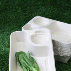 850ml沙拉托盤 原木色外觀,單個尺寸225*165*45mm,重量為27g,可搭配PET蓋子。適用于餐飲行業外賣配送,學校食堂餐盤 包裝方式為50個/包,500個/箱。采用可完全回收循環使用的植物纖維漿(木、竹、甘蔗漿等)或廢棄紙品再生漿作為基料,采用紙漿模塑生產工藝制造而成,安全無害易回收利用,可堆肥可被自然降解,不會造成環境污染。