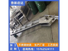 白條提升機-全自動豬體上掛機主要由電動機蝸輪減速器、機架、傳動鏈、漲緊裝置、導引推力板等組成。電動機裝在呈35度傾斜的機架上部,通過蝸輪減速器帶動鏈輪使傳動鏈運轉。鏈條上每隔1500毫米裝有一只導引推力板,推動滾輪沿斜面軌道前進,從而將掛在滾輪鉤子上的毛豬或白條肉提升至所要求的高度。根據屠宰車間生產工藝的需要,當改變傳動鏈的運轉方向時,本機亦可作為下 降機使用。該機具有結構簡單,輕便靈活,操作與維修方便等優點。