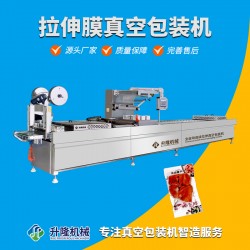 全自動連續拉伸膜真空包裝機,主要由通過下膜加熱拉伸成型,然后將包裝物填入成型好的下膜腔中,接著進入熱封真空室內對包裝物進行真空或充氣,并將上膜與下膜進行熱合,形成包裝袋,在通過橫切、縱切將包裝物進行分割,包裝的產品輸出等一次性完成,操作簡單,減少勞動力,解決招工難問題,從而提高了產品檔次,美化了生產環境,還可用于流水線生產,提高了生產效率,省時、省力、**等真正實現了自動化設備。性能特點: