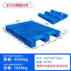 1210川字型塑料托盤是指托盤的長和寬分別為1米2和1米,是比較常用的托盤型號,1210川字型塑料托盤一般情況下指的是底部結構為川字型,面板結構為網格的塑料托盤。