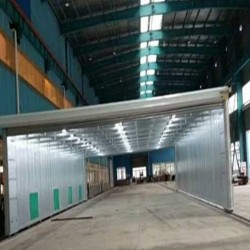 整體移動式噴漆房的設計目的,是為了較大型工件打磨或噴漆的需要。一般情況下每套房體對應2-3個排風凈化工位,哪個工位上的工件需要噴漆時,房體則行走移動到那個工位,其他工位可以繼續打磨工作,待房體內的工件噴漆完畢后,再控制移動房體行走到打磨完畢的工件工位,如此設計可以實現大型工件的不間斷連續噴漆工作。房體為鋼結構構造,房體立柱設置有兩臺電動驅動行走機構,行走機構沿地面軌道行走。移動房體兩端設置有電動卷簾大門,房體行走時,大門升起,待到達位置時,大門降落關閉。大門與行走機構由電氣控制部分連鎖控制,大門升起后,房體才可移動行走。